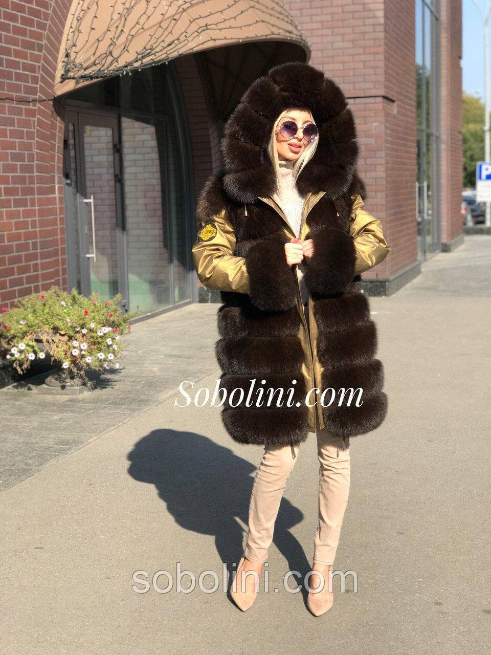 Стильна парка, 100% ексклюзив! Парка хутром наверх, широка поперечна викладка хутра, колір під соболь баргузин. Елітна водовідштовхувальна плащівка бронза надає парку статусність і індивідуальність. Модель розрахована на будь-які морози, дуже тепла та зручна!! Длина 90см, без отстежки на жилет.