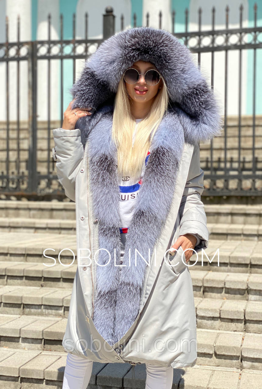 Розкішна парка з хутром блюфроста без хутряних манжетів. Хутро Блюфроста: повністю в капюшоні, полиці всередині по 20 см. На спинці іспанський стрижений крій сірого кольору. 100% якість Меха та пошиття! Парка на подовження внизу. Хутро в парку відстібається. Плащівка матова з водовідштовхувальною основою. Купуючи цю парку, Ви купуєте парку 3 в 1. Додаткові застібки для носіння хутром назовні. Колір тканини та фактучність за бажанням. У наявності великий асортимент тканин за кольорами на вибір. Довжина парки 100/105 см