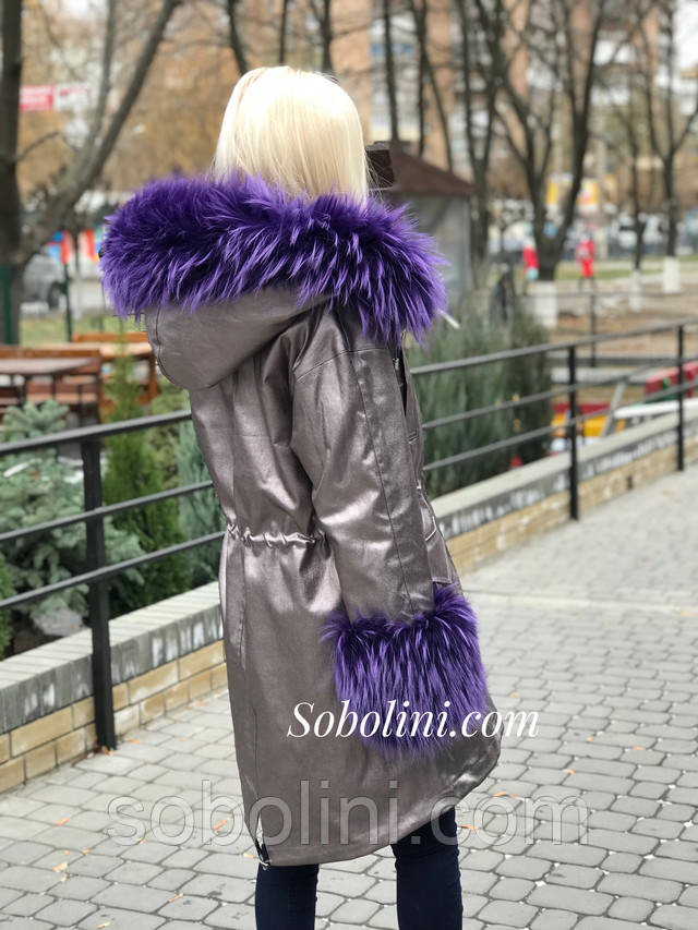 Чудова парку з хутром рідкісного виду єнота-альбіноса (білий з довгим ворсом хутро) і отстежкой на стаціонарний жилетка з капюшоном. Верх парки виконаний з водовідштовхувального плащівки, довжина 85/95см. Поєднання з фіолетовим кольором хутра робить парку такою стильною і яскравою, всі хто її бачить -закохуються!