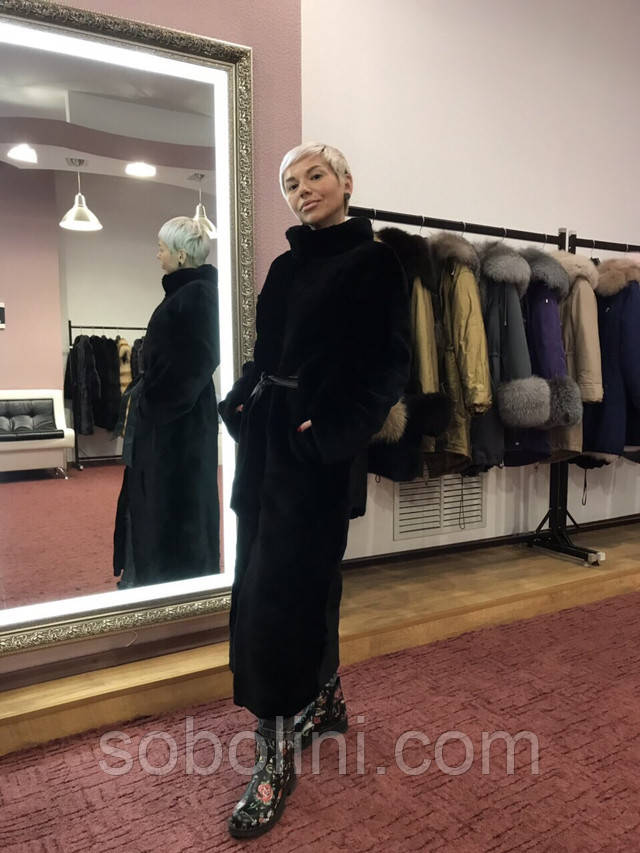 Стильна шуба-пальто з хутра канадського бобра (аукційне елітне хутро), колір чорний, довжина 120 см, комір-стійка.