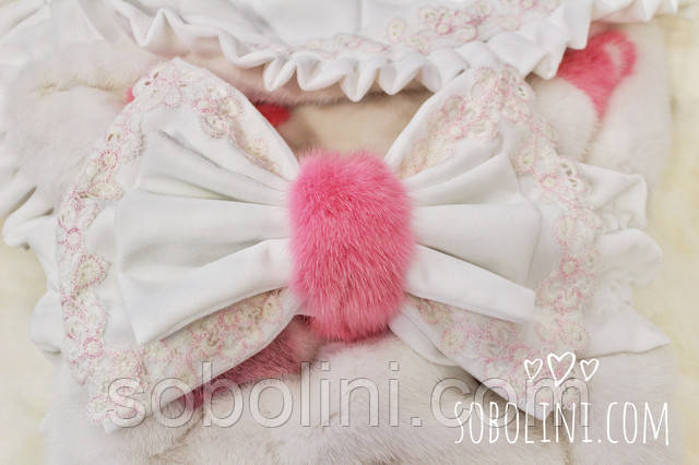 Ексклюзив! Конверт-ковдра для немовлят із аукціонної білої норки з ніжною інкрустацією, декор — французький натуральний оксамит і французьке мереживо. Розмір 100*100 см.