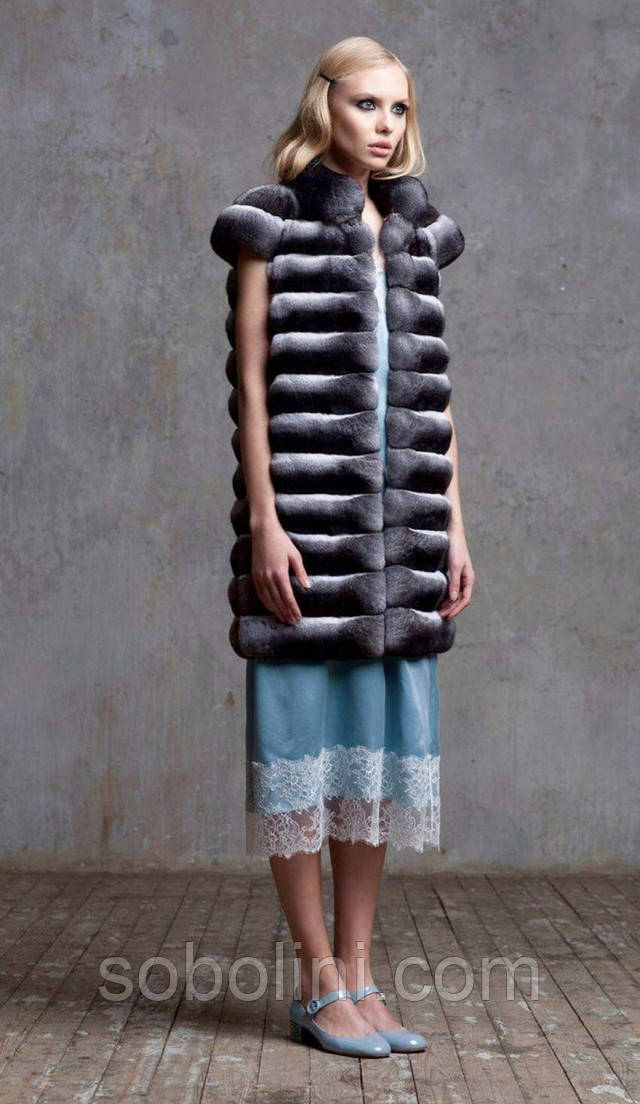 Шиншила — королівське хутро, таке витончене, м'яке невагоме. Жилет із шиншили з плічками. Комір-стійка, поперечний крій.
